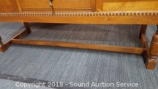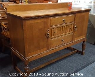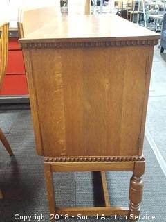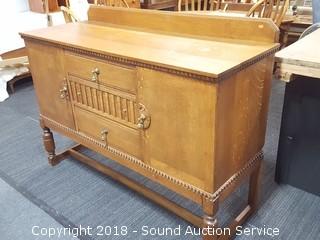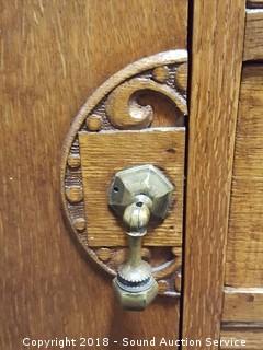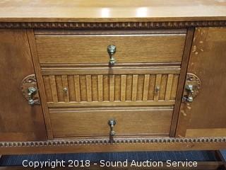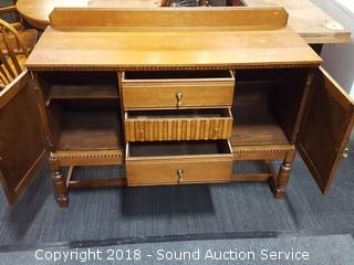 Has 3 drawers, 2 cabinets, solid brass hardware, nice finish. Approx. 37" H, 54" W, 20" D. The auctioneer shall not be responsible for the correct description, authenticity, genuineness of, estimated selling price of, or defect in any lot, and makes no warranty in connection therewith. No allowance will be made or sale set aside on account of any incorrectness, error in cataloging, or any imperfection not noted. No deduction will be allowed on damaged articles as all goods being exposed for public exhibition are sold “as is” and without recourse. All measurements and sizes - are approximate. CLAIMS - No claims will be allowed after goods are removed from premises. All lots - to be sold AS IS, WHERE IS. ALL SALES FINAL, WE DO NOT ACCEPT RETURNS.
