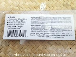 Includes: Moisture Lotion, Shower Gel, Eye Mask, Candles & Lufa. The auctioneer shall not be responsible for the correct description, authenticity, genuineness of, estimated selling price of, or defect in any lot, and makes no warranty in connection therewith. No allowance will be made or sale set aside on account of any incorrectness, error in cataloging, or any imperfection not noted. No deduction will be allowed on damaged articles as all goods being exposed for public exhibition are sold “as is” and without recourse. All measurements and sizes - are approximate. CLAIMS - No claims will be allowed after goods are removed from premises. All lots - to be sold AS IS, WHERE IS. ALL SALES FINAL, WE DO NOT ACCEPT RETURNS.