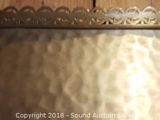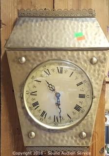Not the original movement. Body is hand hammered brass. Approx. 14" x 10". The auctioneer shall not be responsible for the correct description, authenticity, genuineness of, estimated selling price of, or defect in any lot, and makes no warranty in connection therewith. No allowance will be made or sale set aside on account of any incorrectness, error in cataloging, or any imperfection not noted. No deduction will be allowed on damaged articles as all goods being exposed for public exhibition are sold “as is” and without recourse. All measurements and sizes - are approximate. CLAIMS - No claims will be allowed after goods are removed from premises. All lots - to be sold AS IS, WHERE IS. ALL SALES FINAL, WE DO NOT ACCEPT RETURNS.