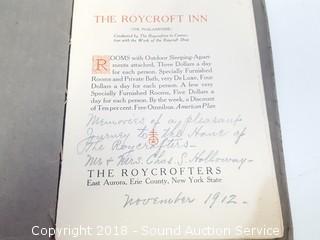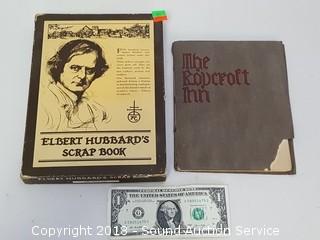 Inn book is pencil signed 1912, where Elbert Hubbards guest stayed. Elbert Hubbard scrapbook is dated 1923, in mint condition, leather bound. Comes with original box. The auctioneer shall not be responsible for the correct description, authenticity, genuineness of, estimated selling price of, or defect in any lot, and makes no warranty in connection therewith. No allowance will be made or sale set aside on account of any incorrectness, error in cataloging, or any imperfection not noted. No deduction will be allowed on damaged articles as all goods being exposed for public exhibition are sold “as is” and without recourse. All measurements and sizes - are approximate. CLAIMS - No claims will be allowed after goods are removed from premises. All lots - to be sold AS IS, WHERE IS. ALL SALES FINAL, WE DO NOT ACCEPT RETURNS.