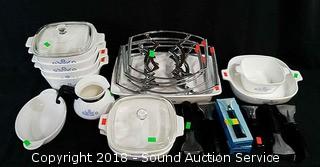 26 pieces total (including lids). Includes: 22 oz dish, (3) 1QT dishes (1 lid), 1-3/4QT dish, 9" dish, 2QT casserole dish, (2) 7" dishes, small teapot, 14oz dish and 4 Corning ware trivets. The auctioneer shall not be responsible for the correct description, authenticity, genuineness of, estimated selling price of, or defect in any lot, and makes no warranty in connection therewith. No allowance will be made or sale set aside on account of any incorrectness, error in cataloging, or any imperfection not noted. No deduction will be allowed on damaged articles as all goods being exposed for public exhibition are sold “as is” and without recourse. All measurements and sizes - are approximate. CLAIMS - No claims will be allowed after goods are removed from premises. All lots - to be sold AS IS, WHERE IS. ALL SALES FINAL, WE DO NOT ACCEPT RETURNS.