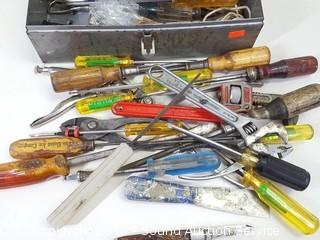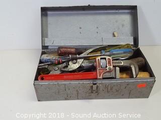 Includes: Pipe Wrench, Vice Grips, Various Screwdrivers, Crescent Wrenches, and more. Toolbox is 4" x 12" x 5-1/2". The auctioneer shall not be responsible for the correct description, authenticity, genuineness of, estimated selling price of, or defect in any lot, and makes no warranty in connection therewith. No allowance will be made or sale set aside on account of any incorrectness, error in cataloging, or any imperfection not noted. No deduction will be allowed on damaged articles as all goods being exposed for public exhibition are sold “as is” and without recourse. All measurements and sizes - are approximate. CLAIMS - No claims will be allowed after goods are removed from premises. All lots - to be sold AS IS, WHERE IS. ALL SALES FINAL, WE DO NOT ACCEPT RETURNS.