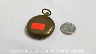 Works, in excellent condition, some wear on the patina on the back of the case. Approx. 1-3/4" diameter. The auctioneer shall not be responsible for the correct description, authenticity, genuineness of, estimated selling price of, or defect in any lot, and makes no warranty in connection therewith. No allowance will be made or sale set aside on account of any incorrectness, error in cataloging, or any imperfection not noted. No deduction will be allowed on damaged articles as all goods being exposed for public exhibition are sold “as is” and without recourse. All measurements and sizes - are approximate. CLAIMS - No claims will be allowed after goods are removed from premises. All lots - to be sold AS IS, WHERE IS. ALL SALES FINAL, WE DO NOT ACCEPT RETURNS.