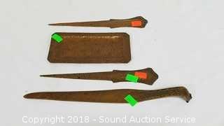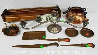 Includes: Planter Box, Copper Pot, Copper Letter Openers, Dishes, Copper Candelabra. The auctioneer shall not be responsible for the correct description, authenticity, genuineness of, estimated selling price of, or defect in any lot, and makes no warranty in connection therewith. No allowance will be made or sale set aside on account of any incorrectness, error in cataloging, or any imperfection not noted. No deduction will be allowed on damaged articles as all goods being exposed for public exhibition are sold “as is” and without recourse. All measurements and sizes - are approximate. CLAIMS - No claims will be allowed after goods are removed from premises. All lots - to be sold AS IS, WHERE IS. ALL SALES FINAL, WE DO NOT ACCEPT RETURNS.