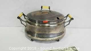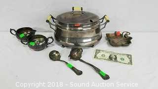 Includes: Benedict Cream and Sugar, Serving Spoons, Meridian Soup Tureen w/Bakelite Handles. The auctioneer shall not be responsible for the correct description, authenticity, genuineness of, estimated selling price of, or defect in any lot, and makes no warranty in connection therewith. No allowance will be made or sale set aside on account of any incorrectness, error in cataloging, or any imperfection not noted. No deduction will be allowed on damaged articles as all goods being exposed for public exhibition are sold “as is” and without recourse. All measurements and sizes - are approximate. CLAIMS - No claims will be allowed after goods are removed from premises. All lots - to be sold AS IS, WHERE IS. ALL SALES FINAL, WE DO NOT ACCEPT RETURNS.