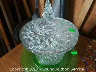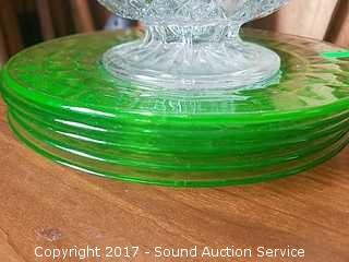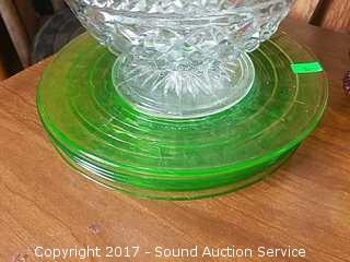 Includes: (2) egg trays, divided dish, vaseline glass plates and covered dish.