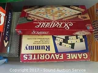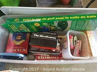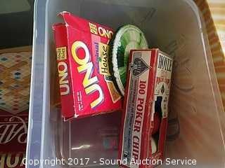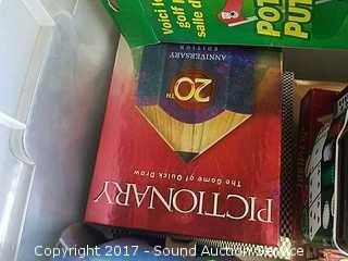Includes poker set, the potty putter, scrabble, pictionary, newlywed game, uno and more. Comes with tote. Please refer to photos.
