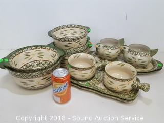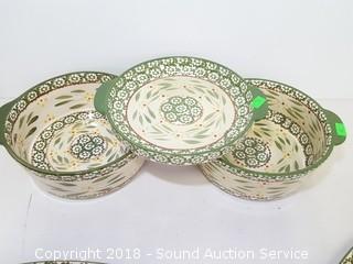 Includes: 2.5QT Bowl, 1.5QT Bowl, (2) 7-1/2" x 14" Platters, 1QT Casserole w/Lid, 1QT Casserole, 1.75QT Casserole, (4) 18oz Soup Bowls, and (2) Soup Platters. The auctioneer shall not be responsible for the correct description, authenticity, genuineness of, estimated selling price of, or defect in any lot, and makes no warranty in connection therewith. No allowance will be made or sale set aside on account of any incorrectness, error in cataloging, or any imperfection not noted. No deduction will be allowed on damaged articles as all goods being exposed for public exhibition are sold “as is” and without recourse. All measurements and sizes - are approximate. CLAIMS - No claims will be allowed after goods are removed from premises. All lots - to be sold AS IS, WHERE IS. ALL SALES FINAL, WE DO NOT ACCEPT RETURNS.