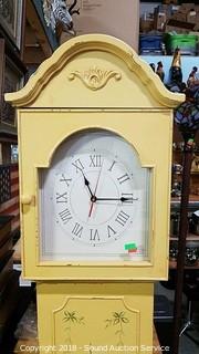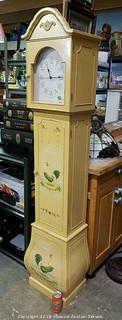 Quartz movement, center is a cabinet. Manufactured in 2011. Approx. 5ft 9", 12" W, 10" D. The auctioneer shall not be responsible for the correct description, authenticity, genuineness of, estimated selling price of, or defect in any lot, and makes no warranty in connection therewith. No allowance will be made or sale set aside on account of any incorrectness, error in cataloging, or any imperfection not noted. No deduction will be allowed on damaged articles as all goods being exposed for public exhibition are sold “as is” and without recourse. All measurements and sizes - are approximate. CLAIMS - No claims will be allowed after goods are removed from premises. All lots - to be sold AS IS, WHERE IS. ALL SALES FINAL, WE DO NOT ACCEPT RETURNS.