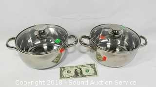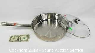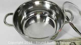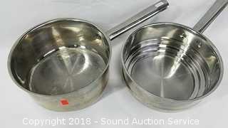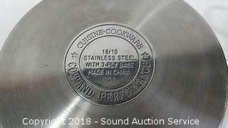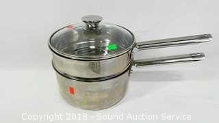 Count includes lids. Includes: 5QT Stainless Pan w/Lid, (2) Cuisine Cookware Command Performance 3QT Pots w/Lids, and Wolfgang Puck Double Boiler w/Lid. The auctioneer shall not be responsible for the correct description, authenticity, genuineness of, estimated selling price of, or defect in any lot, and makes no warranty in connection therewith. No allowance will be made or sale set aside on account of any incorrectness, error in cataloging, or any imperfection not noted. No deduction will be allowed on damaged articles as all goods being exposed for public exhibition are sold “as is” and without recourse. All measurements and sizes - are approximate. CLAIMS - No claims will be allowed after goods are removed from premises. All lots - to be sold AS IS, WHERE IS. ALL SALES FINAL, WE DO NOT ACCEPT RETURNS.