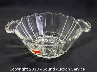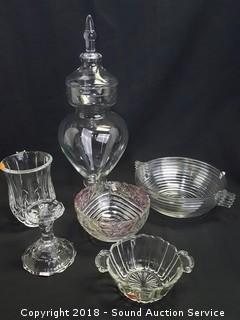 Lot #0002: Glass Canister, Vase, Dishes & Candlestick Holder