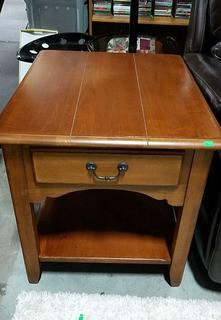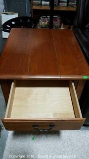 Solid wood, dovetail construction, single drawer. Approx. 23" H, 22" W, 26" D. The auctioneer shall not be responsible for the correct description, authenticity, genuineness of, estimated selling price of, or defect in any lot, and makes no warranty in connection therewith. No allowance will be made or sale set aside on account of any incorrectness, error in cataloging, or any imperfection not noted. No deduction will be allowed on damaged articles as all goods being exposed for public exhibition are sold “as is” and without recourse. All measurements and sizes - are approximate. CLAIMS - No claims will be allowed after goods are removed from premises. All lots - to be sold AS IS, WHERE IS. ALL SALES FINAL, WE DO NOT ACCEPT RETURNS.