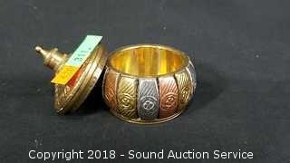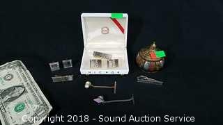 Also comes with brass trinket dish and other cuff links and tie clips. Hickok cuff links are monogrammed "R", come with original box. The auctioneer shall not be responsible for the correct description, authenticity, genuineness of, estimated selling price of, or defect in any lot, and makes no warranty in connection therewith. No allowance will be made or sale set aside on account of any incorrectness, error in cataloging, or any imperfection not noted. No deduction will be allowed on damaged articles as all goods being exposed for public exhibition are sold “as is” and without recourse. All measurements and sizes - are approximate. CLAIMS - No claims will be allowed after goods are removed from premises. All lots - to be sold AS IS, WHERE IS. ALL SALES FINAL, WE DO NOT ACCEPT RETURNS.