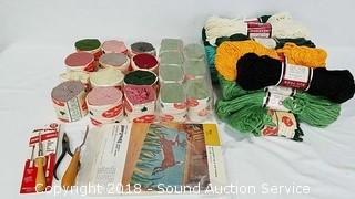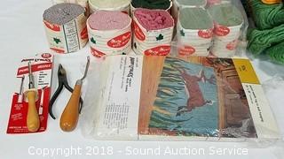 Has stencils, wool and latch hook. The auctioneer shall not be responsible for the correct description, authenticity, genuineness of, estimated selling price of, or defect in any lot, and makes no warranty in connection therewith. No allowance will be made or sale set aside on account of any incorrectness, error in cataloging, or any imperfection not noted. No deduction will be allowed on damaged articles as all goods being exposed for public exhibition are sold “as is” and without recourse. All measurements and sizes - are approximate. CLAIMS - No claims will be allowed after goods are removed from premises. All lots - to be sold AS IS, WHERE IS. ALL SALES FINAL, WE DO NOT ACCEPT RETURNS.