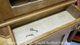 Solid oak, single drawer, skeleton key locks with 2 keys. Approx. 6ft H, 3ft W, 23-1/2" D. The auctioneer shall not be responsible for the correct description, authenticity, genuineness of, estimated selling price of, or defect in any lot, and makes no warranty in connection therewith. No allowance will be made or sale set aside on account of any incorrectness, error in cataloging, or any imperfection not noted. No deduction will be allowed on damaged articles as all goods being exposed for public exhibition are sold “as is” and without recourse. All measurements and sizes - are approximate. CLAIMS - No claims will be allowed after goods are removed from premises. All lots - to be sold AS IS, WHERE IS. ALL SALES FINAL, WE DO NOT ACCEPT RETURNS.