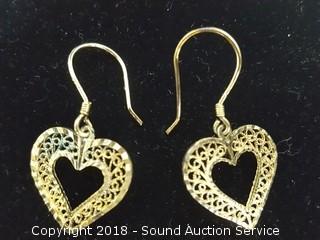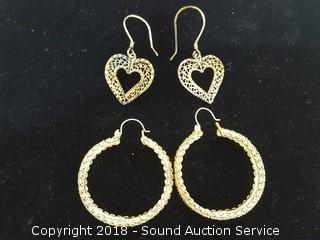 Includes: Sterling Gold Tone Filigree Heart Earrings (3/4"), and 10K GF Filigree Hoop Earrings w/14K Ear Wires (1-1/4"). Both are for pierced ears. The auctioneer shall not be responsible for the correct description, authenticity, genuineness of, estimated selling price of, or defect in any lot, and makes no warranty in connection therewith. No allowance will be made or sale set aside on account of any incorrectness, error in cataloging, or any imperfection not noted. No deduction will be allowed on damaged articles as all goods being exposed for public exhibition are sold “as is” and without recourse. All measurements and sizes - are approximate. CLAIMS - No claims will be allowed after goods are removed from premises. All lots - to be sold AS IS, WHERE IS. ALL SALES FINAL, WE DO NOT ACCEPT RETURNS.