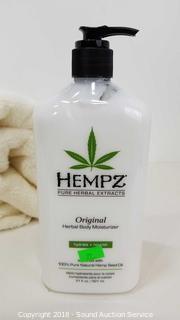 Hempz Pure Herbal 21oz & Merabella Bath Towel - Ivory 30" x 58", has pink spot, refer to photo. The auctioneer shall not be responsible for the correct description, authenticity, genuineness of, estimated selling price of, or defect in any lot, and makes no warranty in connection therewith. No allowance will be made or sale set aside on account of any incorrectness, error in cataloging, or any imperfection not noted. No deduction will be allowed on damaged articles as all goods being exposed for public exhibition are sold “as is” and without recourse. All measurements and sizes - are approximate. CLAIMS - No claims will be allowed after goods are removed from premises. All lots - to be sold AS IS, WHERE IS. ALL SALES FINAL, WE DO NOT ACCEPT RETURNS.