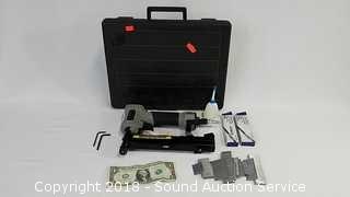 Comes with case, brads, and staples. Uses 18 gauge 1-1/4" brads and staples. The auctioneer shall not be responsible for the correct description, authenticity, genuineness of, estimated selling price of, or defect in any lot, and makes no warranty in connection therewith. No allowance will be made or sale set aside on account of any incorrectness, error in cataloging, or any imperfection not noted. No deduction will be allowed on damaged articles as all goods being exposed for public exhibition are sold “as is” and without recourse. All measurements and sizes - are approximate. CLAIMS - No claims will be allowed after goods are removed from premises. All lots - to be sold AS IS, WHERE IS. ALL SALES FINAL, WE DO NOT ACCEPT RETURNS.