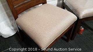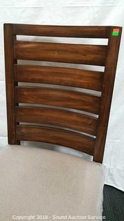 Retail $349.99. Ladderback side chair with upholstery seat. The auctioneer shall not be responsible for the correct description, authenticity, genuineness of, estimated selling price of, or defect in any lot, and makes no warranty in connection therewith. No allowance will be made or sale set aside on account of any incorrectness, error in cataloging, or any imperfection not noted. No deduction will be allowed on damaged articles as all goods being exposed for public exhibition are sold “as is” and without recourse. All measurements and sizes - are approximate. CLAIMS - No claims will be allowed after goods are removed from premises. All lots - to be sold AS IS, WHERE IS. ALL SALES FINAL, WE DO NOT ACCEPT RETURNS.