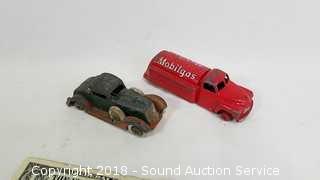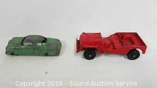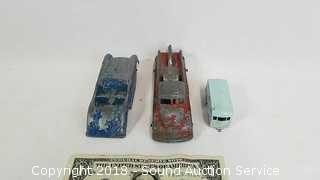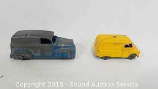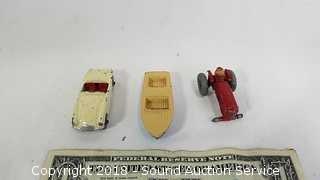 One is a Dinky Toys. The auctioneer shall not be responsible for the correct description, authenticity, genuineness of, estimated selling price of, or defect in any lot, and makes no warranty in connection therewith. No allowance will be made or sale set aside on account of any incorrectness, error in cataloging, or any imperfection not noted. No deduction will be allowed on damaged articles as all goods being exposed for public exhibition are sold “as is” and without recourse. All measurements and sizes - are approximate. CLAIMS - No claims will be allowed after goods are removed from premises. All lots - to be sold AS IS, WHERE IS. ALL SALES FINAL, WE DO NOT ACCEPT RETURNS.