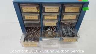 All sorted and labeled. Includes: Electrical Wire Twist Ons, Screws, Nails, Brads and more. Approx. 8" x 10" x 6-1/4". The auctioneer shall not be responsible for the correct description, authenticity, genuineness of, estimated selling price of, or defect in any lot, and makes no warranty in connection therewith. No allowance will be made or sale set aside on account of any incorrectness, error in cataloging, or any imperfection not noted. No deduction will be allowed on damaged articles as all goods being exposed for public exhibition are sold “as is” and without recourse. All measurements and sizes - are approximate. CLAIMS - No claims will be allowed after goods are removed from premises. All lots - to be sold AS IS, WHERE IS. ALL SALES FINAL, WE DO NOT ACCEPT RETURNS.
