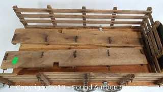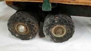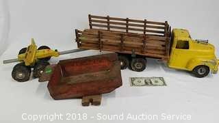 By All American Toy Company. Rubber wheels with homemade flat bed and dumb trailer, rubber wheels. Some rust in the paint. Look great refinsished. Approx. 39" long overall, 7" W, 7" H. The auctioneer shall not be responsible for the correct description, authenticity, genuineness of, estimated selling price of, or defect in any lot, and makes no warranty in connection therewith. No allowance will be made or sale set aside on account of any incorrectness, error in cataloging, or any imperfection not noted. No deduction will be allowed on damaged articles as all goods being exposed for public exhibition are sold “as is” and without recourse. All measurements and sizes - are approximate. CLAIMS - No claims will be allowed after goods are removed from premises. All lots - to be sold AS IS, WHERE IS. ALL SALES FINAL, WE DO NOT ACCEPT RETURNS.