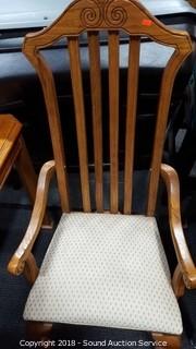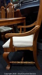 Comes with 6 chairs (2 are captains chairs), (1) 24" leaf. Overall Measures, 30" H x 85" L x 42" W. The auctioneer shall not be responsible for the correct description, authenticity, genuineness of, estimated selling price of, or defect in any lot, and makes no warranty in connection therewith. No allowance will be made or sale set aside on account of any incorrectness, error in cataloging, or any imperfection not noted. No deduction will be allowed on damaged articles as all goods being exposed for public exhibition are sold “as is” and without recourse. All measurements and sizes - are approximate. CLAIMS - No claims will be allowed after goods are removed from premises. All lots - to be sold AS IS, WHERE IS. ALL SALES FINAL, WE DO NOT ACCEPT RETURNS.