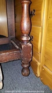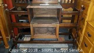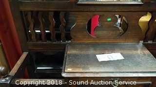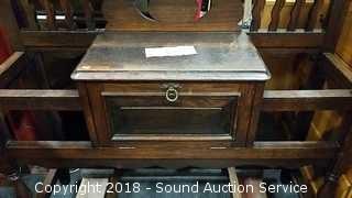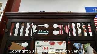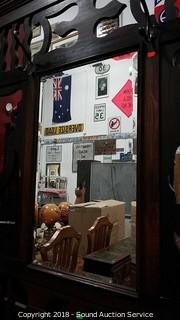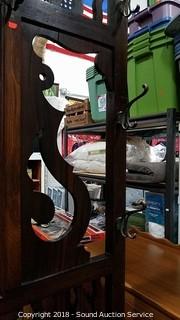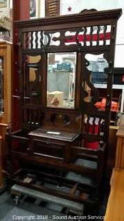 Hand beveled glass mirror, drop down cubby, ornate scrollwork, brass hangers. Looks like it used to have something in the bottom of the umbrella holder, needs replaced. Approx. 87" H, 47-3/4" W, 15" D. The auctioneer shall not be responsible for the correct description, authenticity, genuineness of, estimated selling price of, or defect in any lot, and makes no warranty in connection therewith. No allowance will be made or sale set aside on account of any incorrectness, error in cataloging, or any imperfection not noted. No deduction will be allowed on damaged articles as all goods being exposed for public exhibition are sold “as is” and without recourse. All measurements and sizes - are approximate. CLAIMS - No claims will be allowed after goods are removed from premises. All lots - to be sold AS IS, WHERE IS. ALL SALES FINAL, WE DO NOT ACCEPT RETURNS.