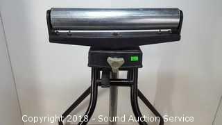 Approx. 13-3/4" roller, 30" to 46" tall adjustable height support. The auctioneer shall not be responsible for the correct description, authenticity, genuineness of, estimated selling price of, or defect in any lot, and makes no warranty in connection therewith. No allowance will be made or sale set aside on account of any incorrectness, error in cataloging, or any imperfection not noted. No deduction will be allowed on damaged articles as all goods being exposed for public exhibition are sold “as is” and without recourse. All measurements and sizes - are approximate. CLAIMS - No claims will be allowed after goods are removed from premises. All lots - to be sold AS IS, WHERE IS. ALL SALES FINAL, WE DO NOT ACCEPT RETURNS.