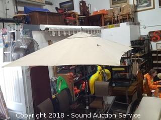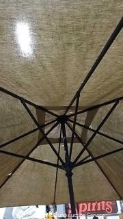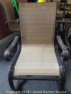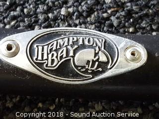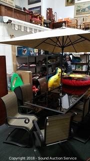 Has umbrella and stand, umbrella has a tear. Glass has an amber tint to it. Comes with 6 Hampton Bay rocking patio chairs. Table is approx. 28" H, 41-1/2" x 71-1/2". The auctioneer shall not be responsible for the correct description, authenticity, genuineness of, estimated selling price of, or defect in any lot, and makes no warranty in connection therewith. No allowance will be made or sale set aside on account of any incorrectness, error in cataloging, or any imperfection not noted. No deduction will be allowed on damaged articles as all goods being exposed for public exhibition are sold “as is” and without recourse. All measurements and sizes - are approximate. CLAIMS - No claims will be allowed after goods are removed from premises. All lots - to be sold AS IS, WHERE IS. ALL SALES FINAL, WE DO NOT ACCEPT RETURNS.