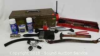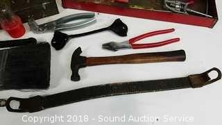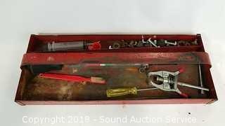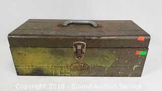 Toolbox is approx. 6" x 17" x 7-1/2". The auctioneer shall not be responsible for the correct description, authenticity, genuineness of, estimated selling price of, or defect in any lot, and makes no warranty in connection therewith. No allowance will be made or sale set aside on account of any incorrectness, error in cataloging, or any imperfection not noted. No deduction will be allowed on damaged articles as all goods being exposed for public exhibition are sold “as is” and without recourse. All measurements and sizes - are approximate. CLAIMS - No claims will be allowed after goods are removed from premises. All lots - to be sold AS IS, WHERE IS. ALL SALES FINAL, WE DO NOT ACCEPT RETURNS.