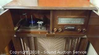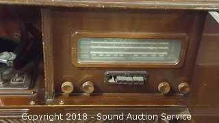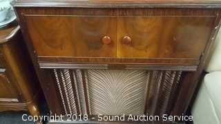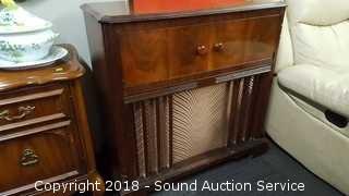 Model 10W61. Has phonograph, band spread shortwave, police shortwave, broadcast manual, and broadcast automatic. Cord is cracking, did not plug in to test. Nice mahogany finish. Approx. 36" H, 36" W, 16-1/2" D. The auctioneer shall not be responsible for the correct description, authenticity, genuineness of, estimated selling price of, or defect in any lot, and makes no warranty in connection therewith. No allowance will be made or sale set aside on account of any incorrectness, error in cataloging, or any imperfection not noted. No deduction will be allowed on damaged articles as all goods being exposed for public exhibition are sold “as is” and without recourse. All measurements and sizes - are approximate. CLAIMS - No claims will be allowed after goods are removed from premises. All lots - to be sold AS IS, WHERE IS. ALL SALES FINAL, WE DO NOT ACCEPT RETURNS.