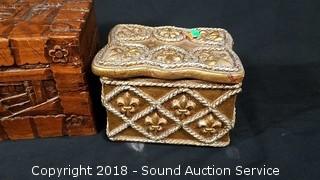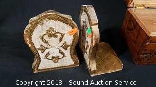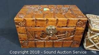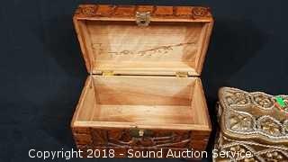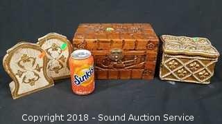 Lot #0263: Carved Wooden Chest, Trinket Box & Bookends
