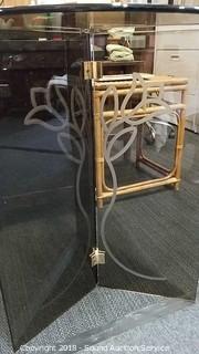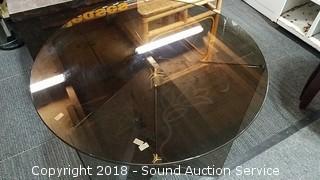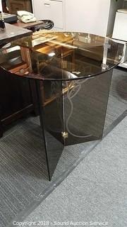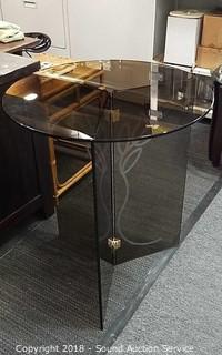 Table and Base is all glass 3/8" thick, the base is cut with a tulip pattern. Approx. 30-1/2" H x 25-1/2" diameter. Don't see any chips or cracks. The auctioneer shall not be responsible for the correct description, authenticity, genuineness of, estimated selling price of, or defect in any lot, and makes no warranty in connection therewith. No allowance will be made or sale set aside on account of any incorrectness, error in cataloging, or any imperfection not noted. No deduction will be allowed on damaged articles as all goods being exposed for public exhibition are sold “as is” and without recourse. All measurements and sizes - are approximate. CLAIMS - No claims will be allowed after goods are removed from premises. All lots - to be sold AS IS, WHERE IS. ALL SALES FINAL, WE DO NOT ACCEPT RETURNS.