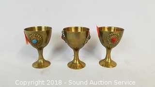 Jeweled with Jasper & Turquoise settings. Includes 6 small goblets tea pot & tray. Tray is 10" diameter, Goblets are 2-1/4" x 1-1/2", teapot is 8-1/4" tall. The auctioneer shall not be responsible for the correct description, authenticity, genuineness of, estimated selling price of, or defect in any lot, and makes no warranty in connection therewith. No allowance will be made or sale set aside on account of any incorrectness, error in cataloging, or any imperfection not noted. No deduction will be allowed on damaged articles as all goods being exposed for public exhibition are sold “as is” and without recourse. All measurements and sizes - are approximate. CLAIMS - No claims will be allowed after goods are removed from premises. All lots - to be sold AS IS, WHERE IS. ALL SALES FINAL, WE DO NOT ACCEPT RETURNS.