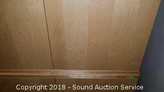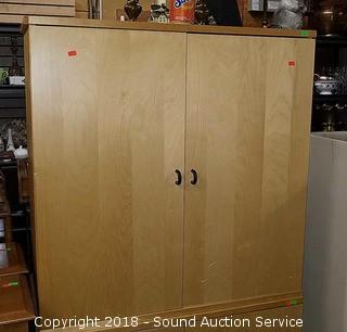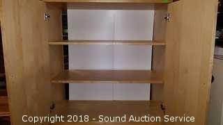 Has 2 adjustable shelves. The corners have been concave rounded. Approx. 32" H, 32" W, 15-1/2" D. The auctioneer shall not be responsible for the correct description, authenticity, genuineness of, estimated selling price of, or defect in any lot, and makes no warranty in connection therewith. No allowance will be made or sale set aside on account of any incorrectness, error in cataloging, or any imperfection not noted. No deduction will be allowed on damaged articles as all goods being exposed for public exhibition are sold “as is” and without recourse. All measurements and sizes - are approximate. CLAIMS - No claims will be allowed after goods are removed from premises. All lots - to be sold AS IS, WHERE IS. ALL SALES FINAL, WE DO NOT ACCEPT RETURNS.