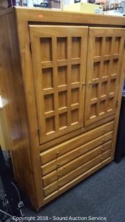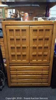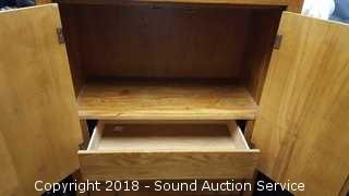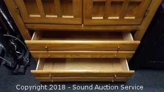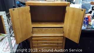 One of the magnets needs replaced for the doors. 3 drawers with upper cabinet. Approx. 54" H, 36" W, 18" D. The auctioneer shall not be responsible for the correct description, authenticity, genuineness of, estimated selling price of, or defect in any lot, and makes no warranty in connection therewith. No allowance will be made or sale set aside on account of any incorrectness, error in cataloging, or any imperfection not noted. No deduction will be allowed on damaged articles as all goods being exposed for public exhibition are sold “as is” and without recourse. All measurements and sizes - are approximate. CLAIMS - No claims will be allowed after goods are removed from premises. All lots - to be sold AS IS, WHERE IS. ALL SALES FINAL, WE DO NOT ACCEPT RETURNS.