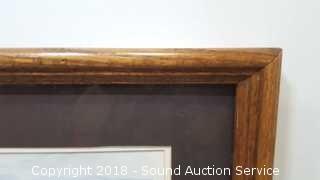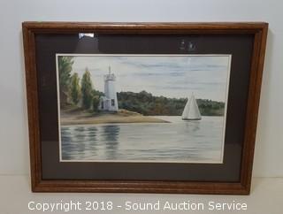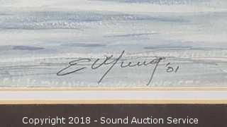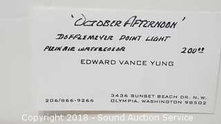 Titled " October Afternoon". Signed "E. W. Yung 2001". Approx. 18" x 24". Edward Vance Yung was born and educated in Oregon, a descendant of wagon train settlers and homesteaders. He was a laborer, a Navy Corpsman, physician in general medicine, surgery & public health. Also, he was a singer, sailor, a craftsman in wood, glass & metal, and he has been attracted to drawing and painting since his youth. He retired 20 years ago & turned to art and serigraph printmaking, using graphite, ink or watercolor sketches as preliminary studies for his serigraphs. Watercolor became his primary interest. He is specially studied composition and pigment chemistry. Vance paints and draws in plain air (outdoors and on location)and finds it makes possible the capture of natural light effects and moods that a camera seldom sees. A plain air painting must be nearly completed within a couple hours to capture the light before it changes. Then his painting is framed and studied and any final brush work is done. The auctioneer shall not be responsible for the correct description, authenticity, genuineness of, estimated selling price of, or defect in any lot, and makes no warranty in connection therewith. No allowance will be made or sale set aside on account of any incorrectness, error in cataloging, or any imperfection not noted. No deduction will be allowed on damaged articles as all goods being exposed for public exhibition are sold “as is” and without recourse. All measurements and sizes - are approximate. CLAIMS - No claims will be allowed after goods are removed from premises. All lots - to be sold AS IS, WHERE IS. ALL SALES FINAL, WE DO NOT ACCEPT RETURNS.