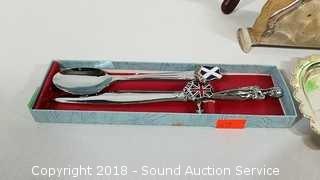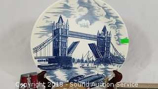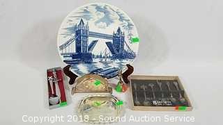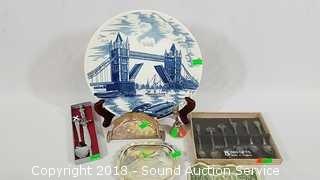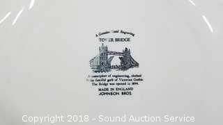Plate is Johnson Brothers, Image of Tower Bridge. Napkin Holder, Bell and Cellector spoons. The auctioneer shall not be responsible for the correct description, authenticity, genuineness of, estimated selling price of, or defect in any lot, and makes no warranty in connection therewith. No allowance will be made or sale set aside on account of any incorrectness, error in cataloging, or any imperfection not noted. No deduction will be allowed on damaged articles as all goods being exposed for public exhibition are sold “as is” and without recourse. All measurements and sizes - are approximate. CLAIMS - No claims will be allowed after goods are removed from premises. All lots - to be sold AS IS, WHERE IS. ALL SALES FINAL, WE DO NOT ACCEPT RETURNS.