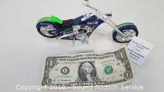 Still has original tag. From The Seattle Seahawks Motorcycle Collection. Approx. 7-1/4" L. The auctioneer shall not be responsible for the correct description, authenticity, genuineness of, estimated selling price of, or defect in any lot, and makes no warranty in connection therewith. No allowance will be made or sale set aside on account of any incorrectness, error in cataloging, or any imperfection not noted. No deduction will be allowed on damaged articles as all goods being exposed for public exhibition are sold “as is” and without recourse. All measurements and sizes - are approximate. CLAIMS - No claims will be allowed after goods are removed from premises. All lots - to be sold AS IS, WHERE IS. ALL SALES FINAL, WE DO NOT ACCEPT RETURNS.