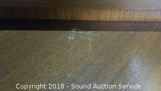 Some surface scratching. Glass doors, porcelain knobs. Has holes in the back for cords. Approx. 28-1/2" H, 36" W, 24" D. The auctioneer shall not be responsible for the correct description, authenticity, genuineness of, estimated selling price of, or defect in any lot, and makes no warranty in connection therewith. No allowance will be made or sale set aside on account of any incorrectness, error in cataloging, or any imperfection not noted. No deduction will be allowed on damaged articles as all goods being exposed for public exhibition are sold “as is” and without recourse. All measurements and sizes - are approximate. CLAIMS - No claims will be allowed after goods are removed from premises. All lots - to be sold AS IS, WHERE IS. ALL SALES FINAL, WE DO NOT ACCEPT RETURNS.