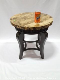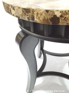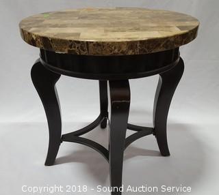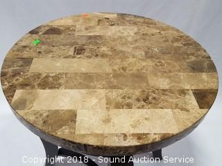 Marble composite top. Approx. 22-1/2" H, 22" diameter. The auctioneer shall not be responsible for the correct description, authenticity, genuineness of, estimated selling price of, or defect in any lot, and makes no warranty in connection therewith. No allowance will be made or sale set aside on account of any incorrectness, error in cataloging, or any imperfection not noted. No deduction will be allowed on damaged articles as all goods being exposed for public exhibition are sold “as is” and without recourse. All measurements and sizes - are approximate. CLAIMS - No claims will be allowed after goods are removed from premises. All lots - to be sold AS IS, WHERE IS. ALL SALES FINAL, WE DO NOT ACCEPT RETURNS.