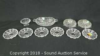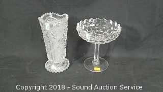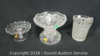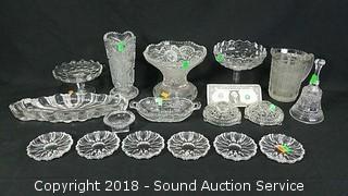 Includes: Compotes, Vases, Coasters, Pitcher, Candlestick Holder, and more. The auctioneer shall not be responsible for the correct description, authenticity, genuineness of, estimated selling price of, or defect in any lot, and makes no warranty in connection therewith. No allowance will be made or sale set aside on account of any incorrectness, error in cataloging, or any imperfection not noted. No deduction will be allowed on damaged articles as all goods being exposed for public exhibition are sold “as is” and without recourse. All measurements and sizes - are approximate. CLAIMS - No claims will be allowed after goods are removed from premises. All lots - to be sold AS IS, WHERE IS. ALL SALES FINAL, WE DO NOT ACCEPT RETURNS.