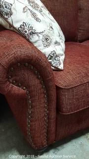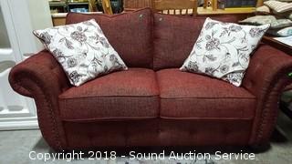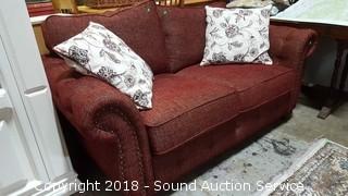 Looks to be in good condition. Only has 2 seat cushions. Comes with 2 matching throw pillows. Has nailhead trim accents. Approx. 70" L, 38" D, 36" H. The auctioneer shall not be responsible for the correct description, authenticity, genuineness of, estimated selling price of, or defect in any lot, and makes no warranty in connection therewith. No allowance will be made or sale set aside on account of any incorrectness, error in cataloging, or any imperfection not noted. No deduction will be allowed on damaged articles as all goods being exposed for public exhibition are sold “as is” and without recourse. All measurements and sizes - are approximate. CLAIMS - No claims will be allowed after goods are removed from premises. All lots - to be sold AS IS, WHERE IS. ALL SALES FINAL, WE DO NOT ACCEPT RETURNS.