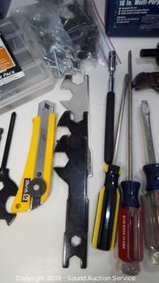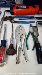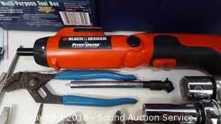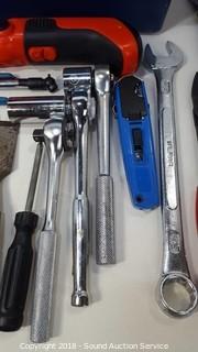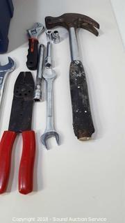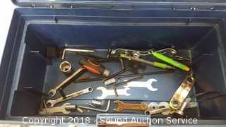 Includes: Pivot Driver Drill, Wrenches, Vice Grips, Hammers, Channel Locks, Sockets, Chisels, Screwdrivers, and more. Toolbox is approx. 7-1/2" H, 15-1/2" L, 7-1/2" D. The auctioneer shall not be responsible for the correct description, authenticity, genuineness of, estimated selling price of, or defect in any lot, and makes no warranty in connection therewith. No allowance will be made or sale set aside on account of any incorrectness, error in cataloging, or any imperfection not noted. No deduction will be allowed on damaged articles as all goods being exposed for public exhibition are sold “as is” and without recourse. All measurements and sizes - are approximate. CLAIMS - No claims will be allowed after goods are removed from premises. All lots - to be sold AS IS, WHERE IS. ALL SALES FINAL, WE DO NOT ACCEPT RETURNS.