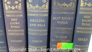 Various Authors: Voltaire, William Shakespeare, Anatole France, Oscar Wilde, Charles Darwin & much more. Hard back in readable condition, spines seem mostly intact no torn pages, that i see, each one has the name Gilletti written inside cover, gold leaf on the bindings. Refer to photos for a complete list of titles & authors.