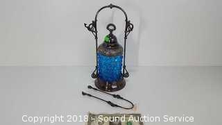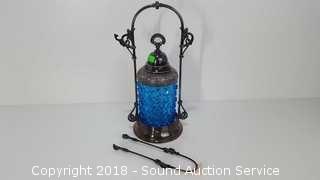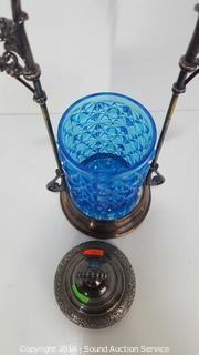 Believe it is silverplate. Pickle jar has blue glass, approx. 11" H, 4" diameter.