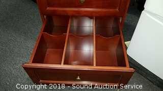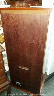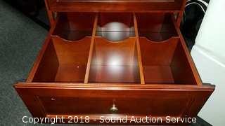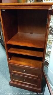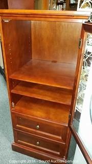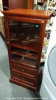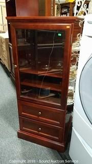 Very well made, looks like it is solid mahogany. Glass is not cracked just a reflection of a wire in the glass. Beveled glass door, adjustable shelves with notching for wire, DVD/CD organizer drawers. In excellent condition. Approx. 50" H, 21-1/2" W, 19" D. Would make a great stereo or media cabinet.