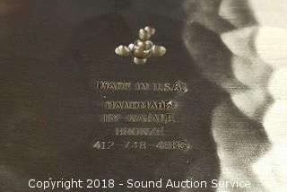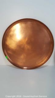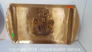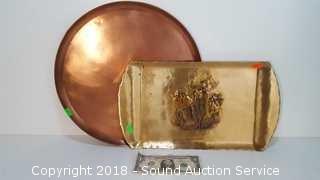 Bronze tray is handcrafted by Natale, image of an elk, 9" x 16". Copper tray is unmarked, approx. 14" diameter.