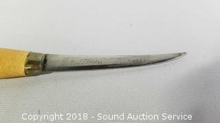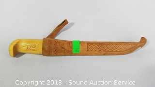 Made in Finland. Blade is enscribed, leather sheath, 4" long blade.